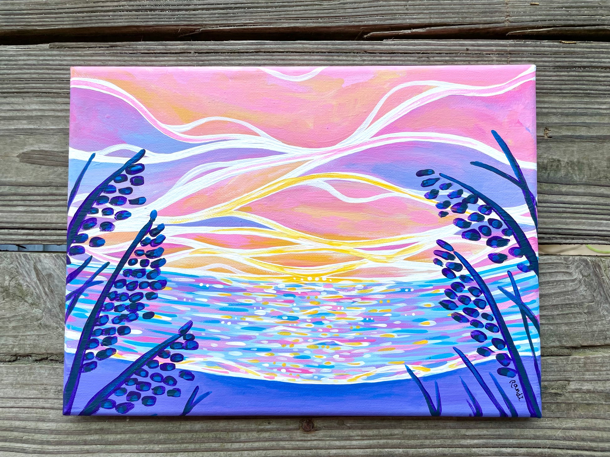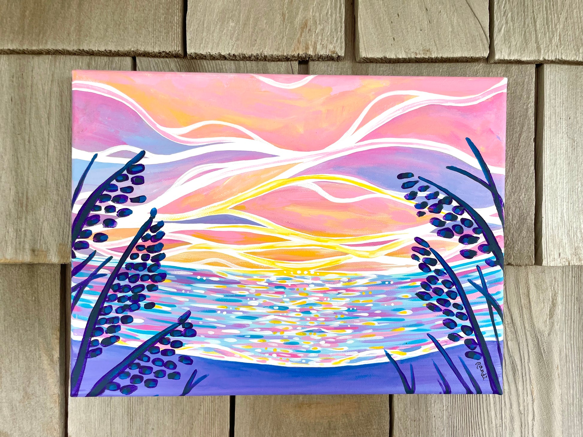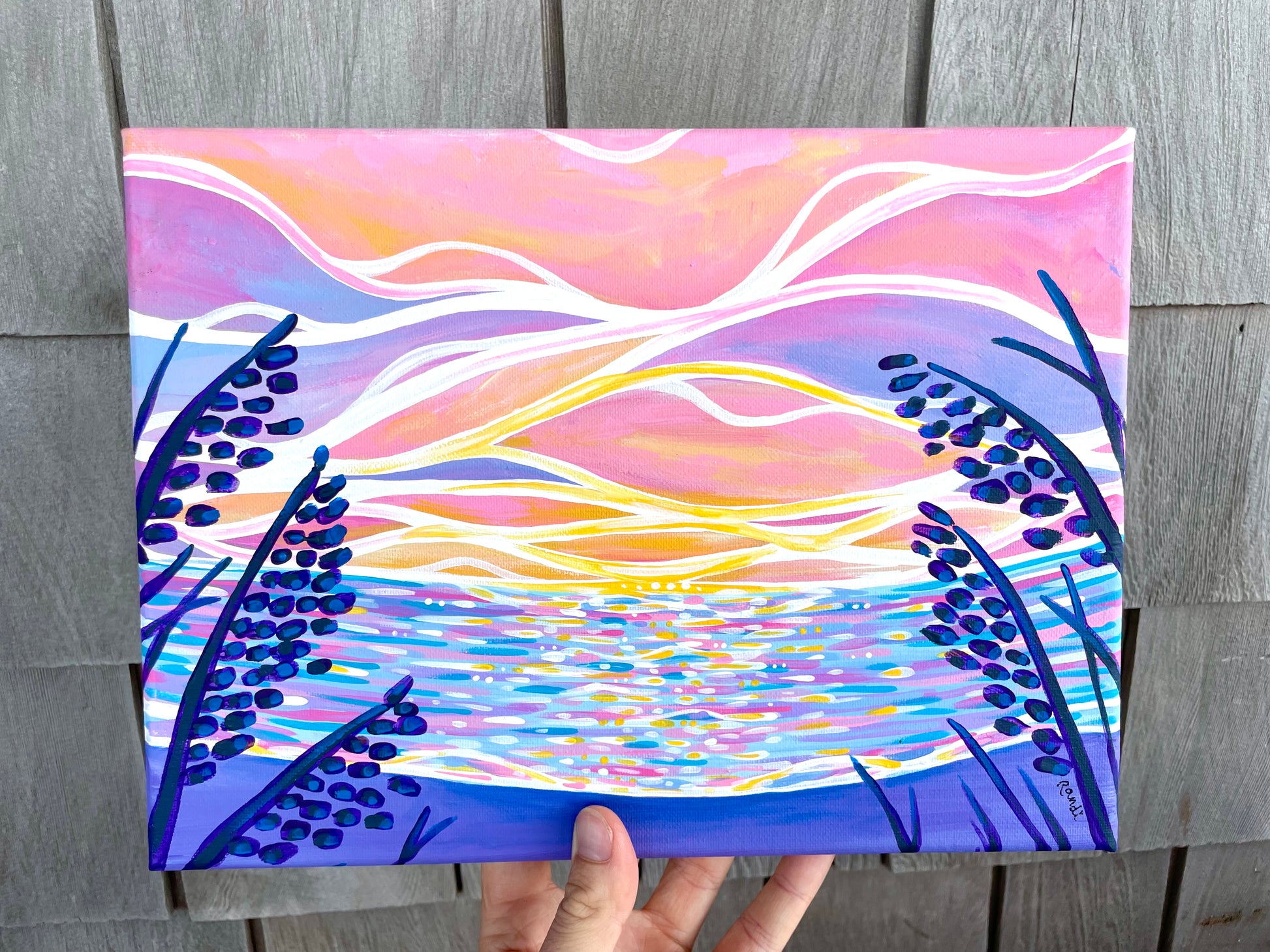 this painting celebrates the spine-tingling sunrises we are blessed with here on hatteras island 💛 when the sea oats are in bloom, the ocean is glassy, and all is calm and colorful, if only for a moment 🌾
