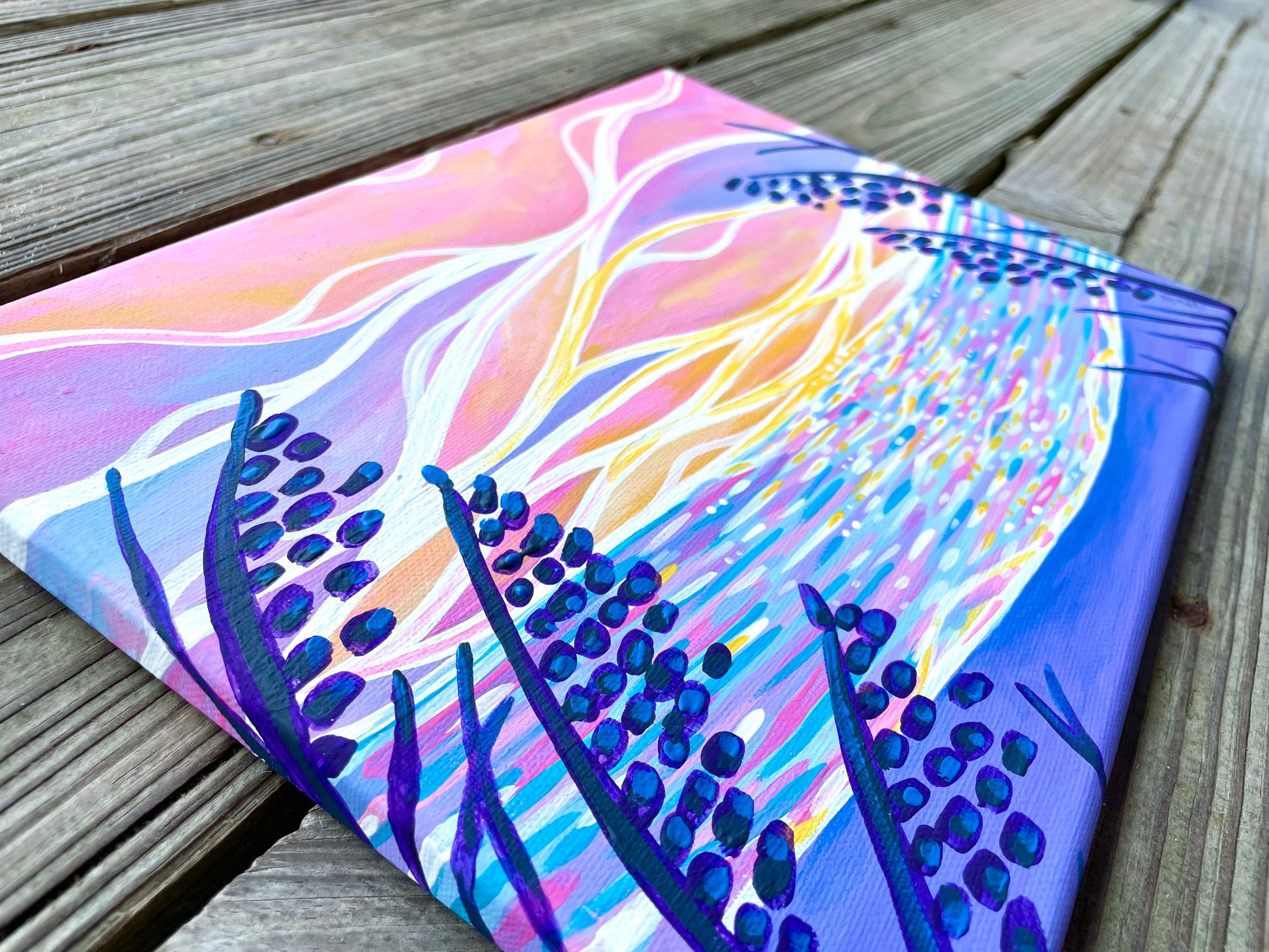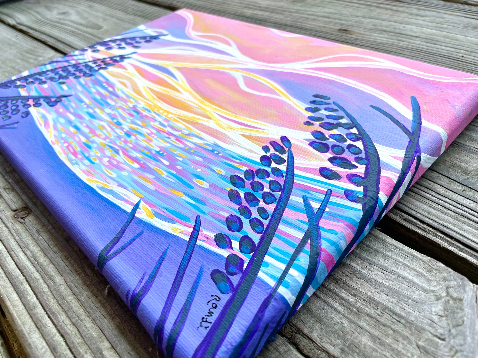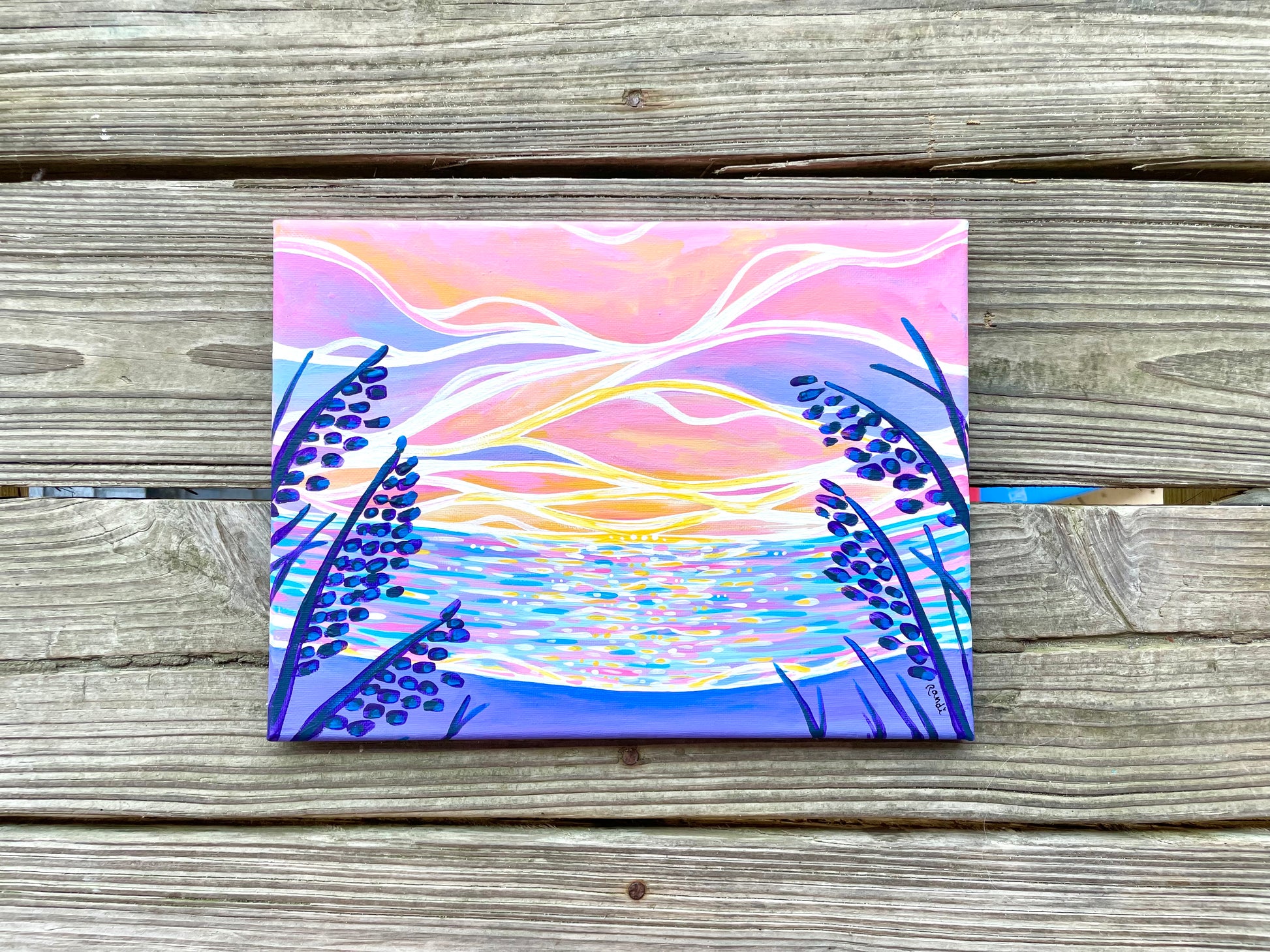 this painting celebrates the spine-tingling sunrises we are blessed with here on hatteras island 💛 when the sea oats are in bloom, the ocean is glassy, and all is calm and colorful, if only for a moment 🌾